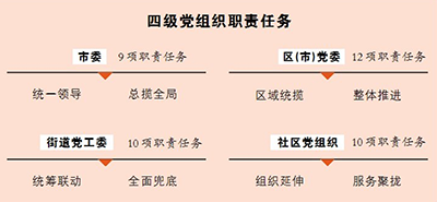 该市坚持四级联动、统一高效,旗帜鲜明加强党对城市工作的全面领导,以责任落实为抓手,进一步明确市、区(市)、街道、社区四级党组织职责任务,建强上下联动、一贯到底的“动力主轴”。着眼强化市、区(市)党委的领导力、牵引力,明确市委“统一领导、总揽全局”的主体责任,区(市)党委“区域统揽、整体推进”的第一责任,确定市委系统建设整体建设、抓规划指导、强化述职评议考核和严肃问责、深化城市基层党建示范市建设等9项职责任务,确定区(市)党委加强整体规划、选优配强街道党工委班子、抓街道促社区、增强街道党工委统筹协调功能等12项职责任务。着眼发挥街道社区党组织领导核心作用,进一步明确街道党工委“统筹联动、全面兜底”的直接责任,社区党组织“组织延伸、服务聚拢”的具体责任,分别确定了推进区域化党建、领导基层治理等10项职责任务。为强化条块协同、上下联动,创新提出各级党建联席会议分别吸纳下级党组织负责人参加,明确上级联席会议对下级联席会议的指导责任等要求。为强化责任落实,首次明确将抓城市基层党建工作情况,纳入对市委部委和市直党组(党委)、区(市)党委部委和区直党组(党委)巡察范围,对工作不力、基层党组织软弱涣散现象严重、党组织弱化虚化边缘化问题突出的,严肃问责。